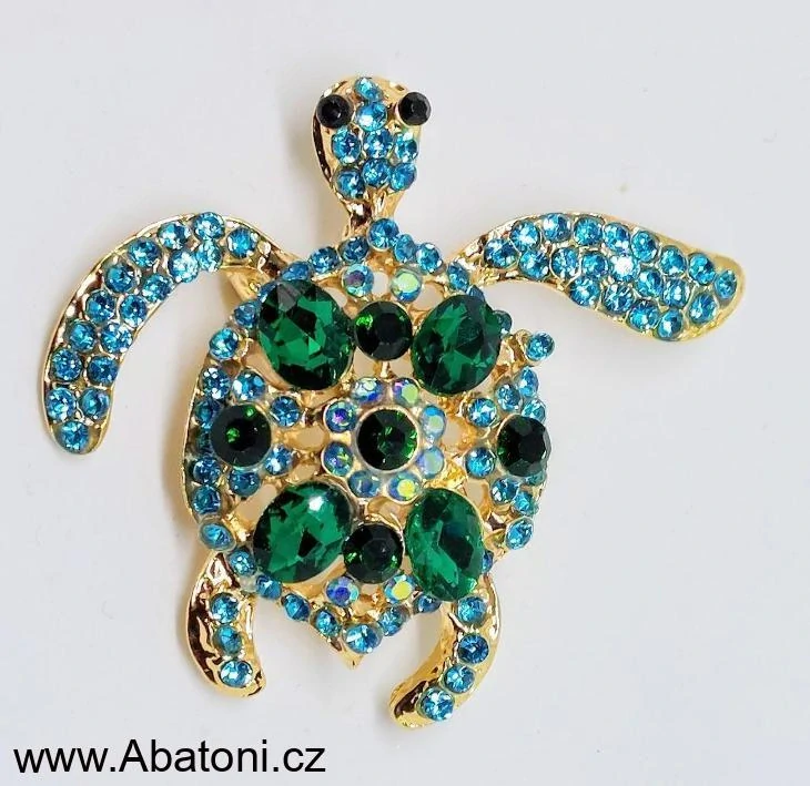 Brož ve tvaru mořské želvy, ozdobená krystaly. Krásně doplní a oživí vaše šaty nebo sako, ale i šálu nebo čepici. Brož se zapíná sponou ze zadní strany.