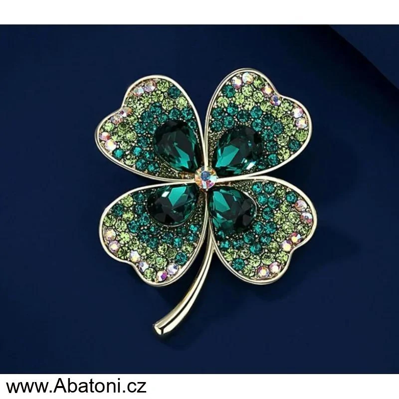 Pozlacená brož ve tvaru čtyřlístku pro štěstí, ozdobená krystaly. Krásně doplní a oživí vaše šaty nebo sako, ale i šálu nebo čepici. Brož se zapíná sponou ze zadní strany.