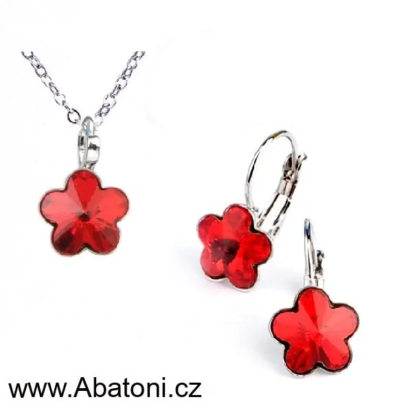 - Swarovski Elements Flower - Stříbrná sada (set, souprava) náušnice a přívěsek s řetízkem červená kytička, květinka 39143.1 Light Siam (červená)