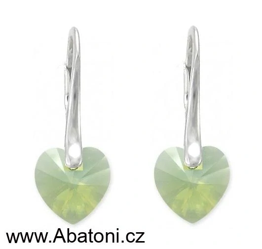 - Swarovski Elements Heart krystal 14mm - Stříbrné náušnice visací zelené srdce, srdíčka 31137.3 Chrysolite Opal (zelená mléčná, světlá mátová)
